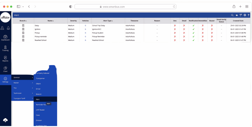 Set alerts for geofencing, inactivity, SOS, trip start/end, and student attendance for better control.